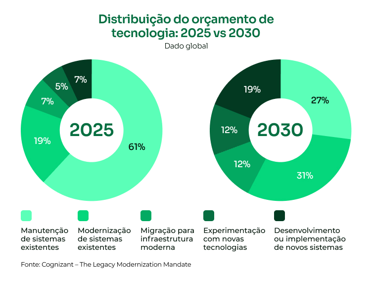 Mais do que uma mudança de prioridade, o que está acontecendo é uma mudança de lógica financeira. A modernização começa a ser financiada pelo próprio legado, por meio da redução de dívida técnica, racionalização de ambientes e eliminação de custos recorrentes.