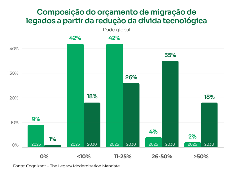 Hoje, a maioria das empresas ainda financia seus programas de modernização com pouco ou nenhum saving de dívida técnica. Até 2030, esse cenário se inverte, mais da metade das organizações espera financiar acima de 26% da modernização com economias geradas pela retirada de tecnologia obsoleta, e quase 20% projetam financiar mais de 50% dessa agenda dessa forma.