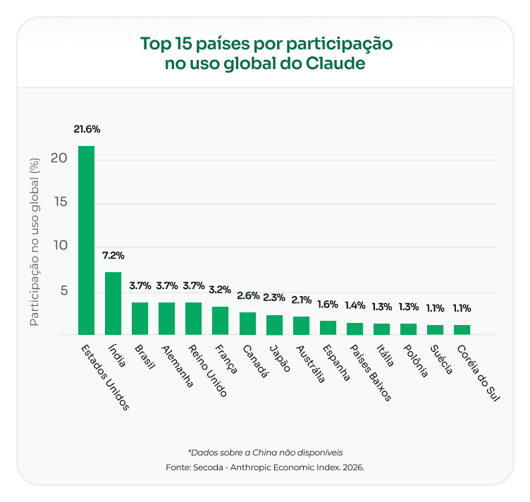 A distribuição global do uso de modelos em cloud oferece um recorte relevante do cenário de IA. Embora não represente a totalidade da adoção, ela indica onde está concentrada a infraestrutura que sustenta aplicações avançadas. Os Estados Unidos respondem por 21,6% do uso global, evidenciando a densidade de ecossistema e capacidade computacional instalada. A partir da segunda posição, a participação se distribui entre países como Índia, Brasil, Japão e Coreia do Sul, formando um bloco intermediário com presença técnica relevante.