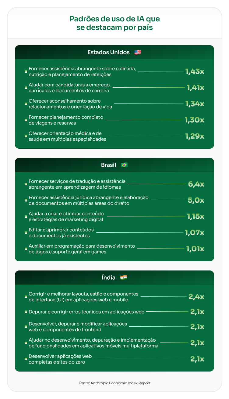 Mas a adoção não é apenas desigual, ela também é contextual. No Brasil, por exemplo, há uso proporcionalmente maior de IA para tradução e serviços jurídicos em comparação à média global. Esse padrão pode refletir características estruturais do país, como a complexidade regulatória e o histórico de adoção de tecnologia no sistema judiciário.