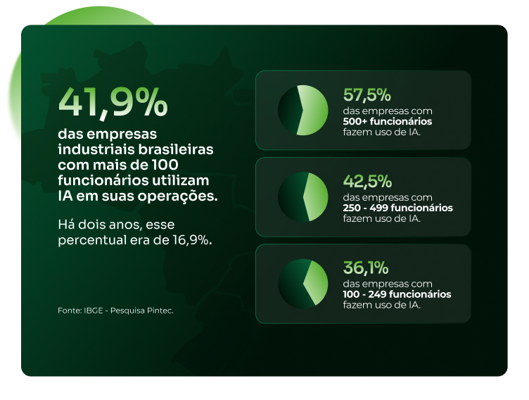 A Pesquisa de Inovação Semestral (Pintec) divulgada pelo IBGE aponta crescimento de 163% no número de empresas industriais que utilizam IA em dois anos e revelam que 41,9% das empresas industriais com mais de 100 funcionários utilizam IA, percentual que, segundo a própria Pintec, era de 16,9% no levantamento anterior.