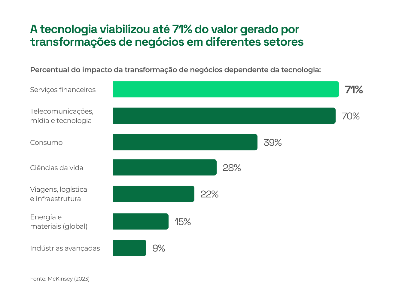Segundo a McKinsey & Company (2024), os setores mais maduros digitalmente são também os que mais convertem tecnologia em valor. O gráfico abaixo mostra o percentual de impacto tecnológico na criação de valor por setor: