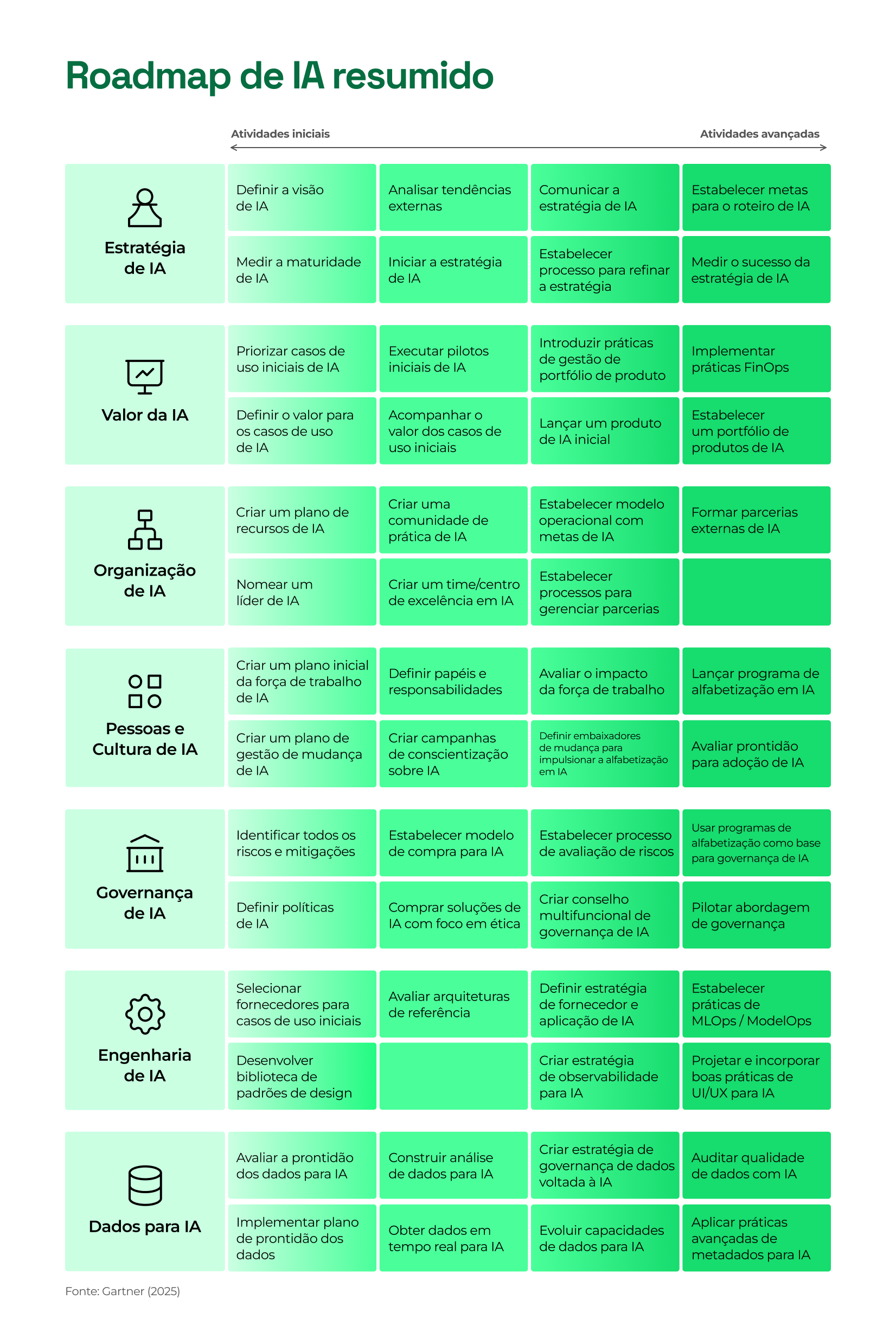 A estrutura AI Maturity and Roadmap, da Gartner, aponta 7 dimensões críticas para escalar IA com impacto:
