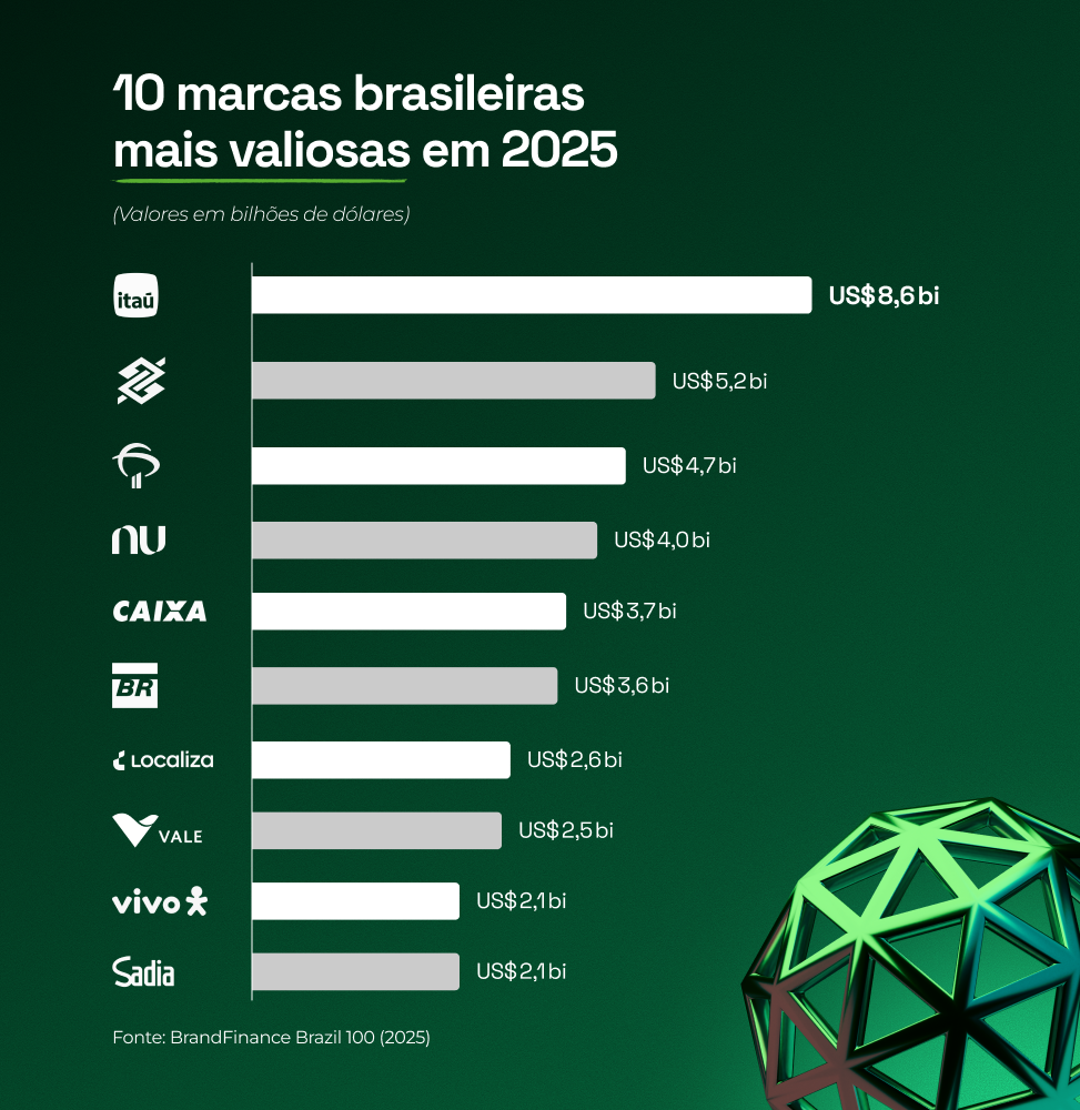 O ranking da Brand Finance Brazil 2025 mostra que os setores mais digitalizados dominam a lista das 10 marcas brasileiras mais valiosas: