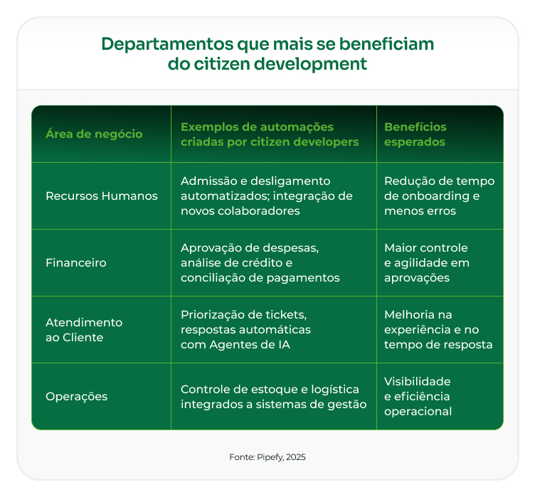 Profissionais que executam processos diariamente tendem a perceber oportunidades de melhoria que dificilmente seriam captadas por equipes externas ao fluxo de trabalho. Ao terem acesso a ferramentas de automação e desenvolvimento simplificado, esses colaboradores passam a transformar rapidamente esse conhecimento em soluções digitais.