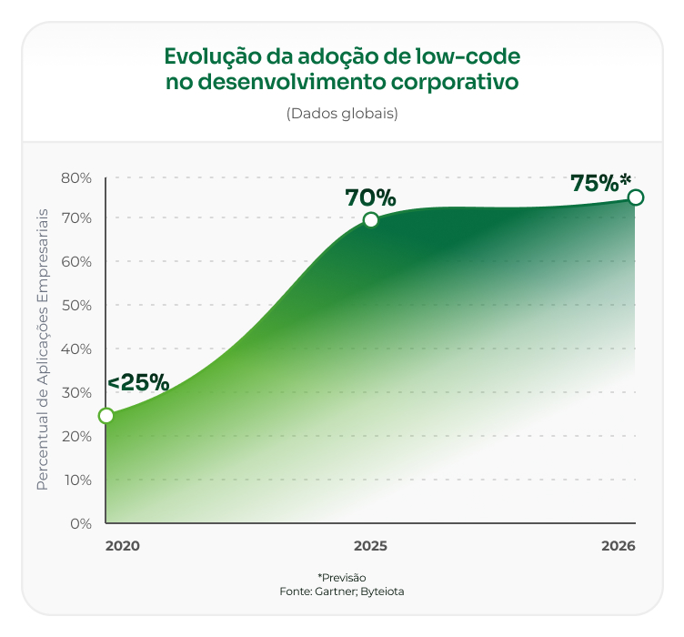 O avanço das plataformas low-code tem alterado rapidamente a forma como aplicações corporativas são desenvolvidas. Uma estimativa citada na análise do Gartner indica que cerca de 70% das novas aplicações empresariais passaram a utilizar tecnologias low-code ou no-code ao longo dessa década, refletindo uma mudança significativa em relação ao início dos anos 2020, quando o desenvolvimento ainda era concentrado quase exclusivamente em equipes especializadas de TI.