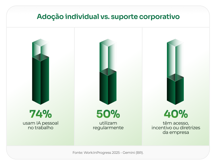A incorporação da IA está sendo conduzida pelas pessoas, no ritmo das suas necessidades, e não pelas diretrizes corporativas, muitas vezes ainda nem definidas. Isso altera profundamente a forma como essa transformação acontece e, principalmente, o quanto de valor ela é capaz de gerar.