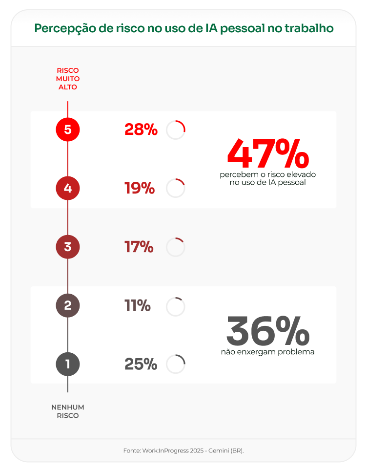 Mais da metade dos profissionais recorre a ferramentas próprias no contexto de trabalho, motivados por fatores práticos como facilidade de acesso, familiaridade e percepção de eficiência. Ao mesmo tempo, esse movimento não acontece sem consciência de risco. A maioria desses profissionais reconhece que o uso de IA pessoal pode expor informações sensíveis e gerar vulnerabilidades relevantes.