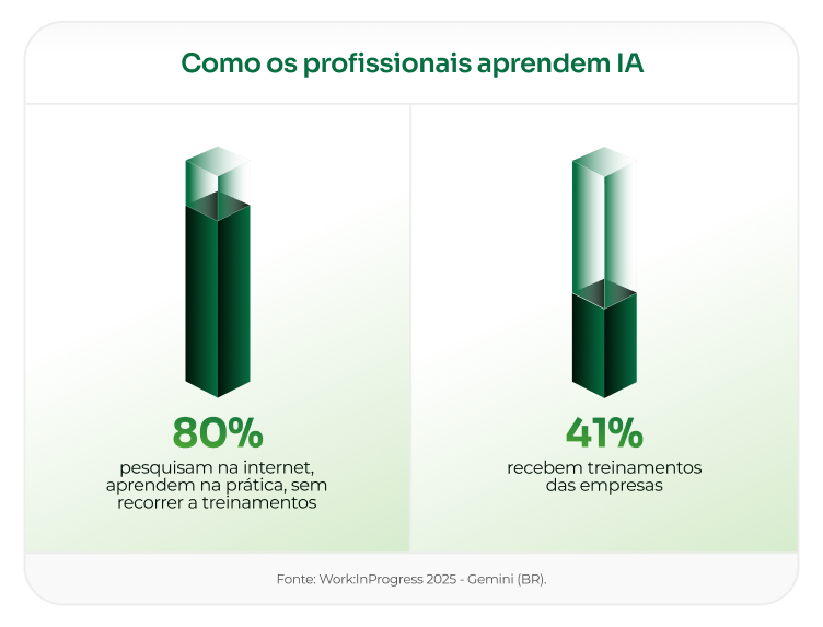 O mesmo estudo ainda mostra que o número de profissionais que aprendem a utilizar IA por conta própria já supera o daqueles que recebem treinamento corporativo.